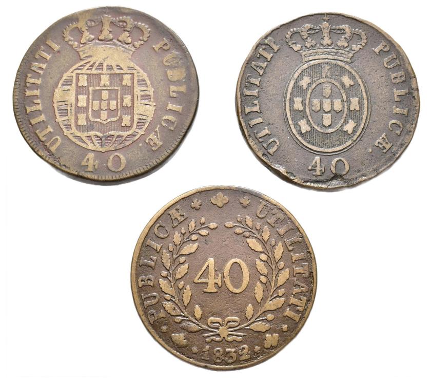 MONEDA EXTRANJERA. PORTUGAL. Lote de 3 piezas de 40 reis: Juan VI 1819, Pedro IV 1828 y Miguel I 1832. BC+/MBC-.