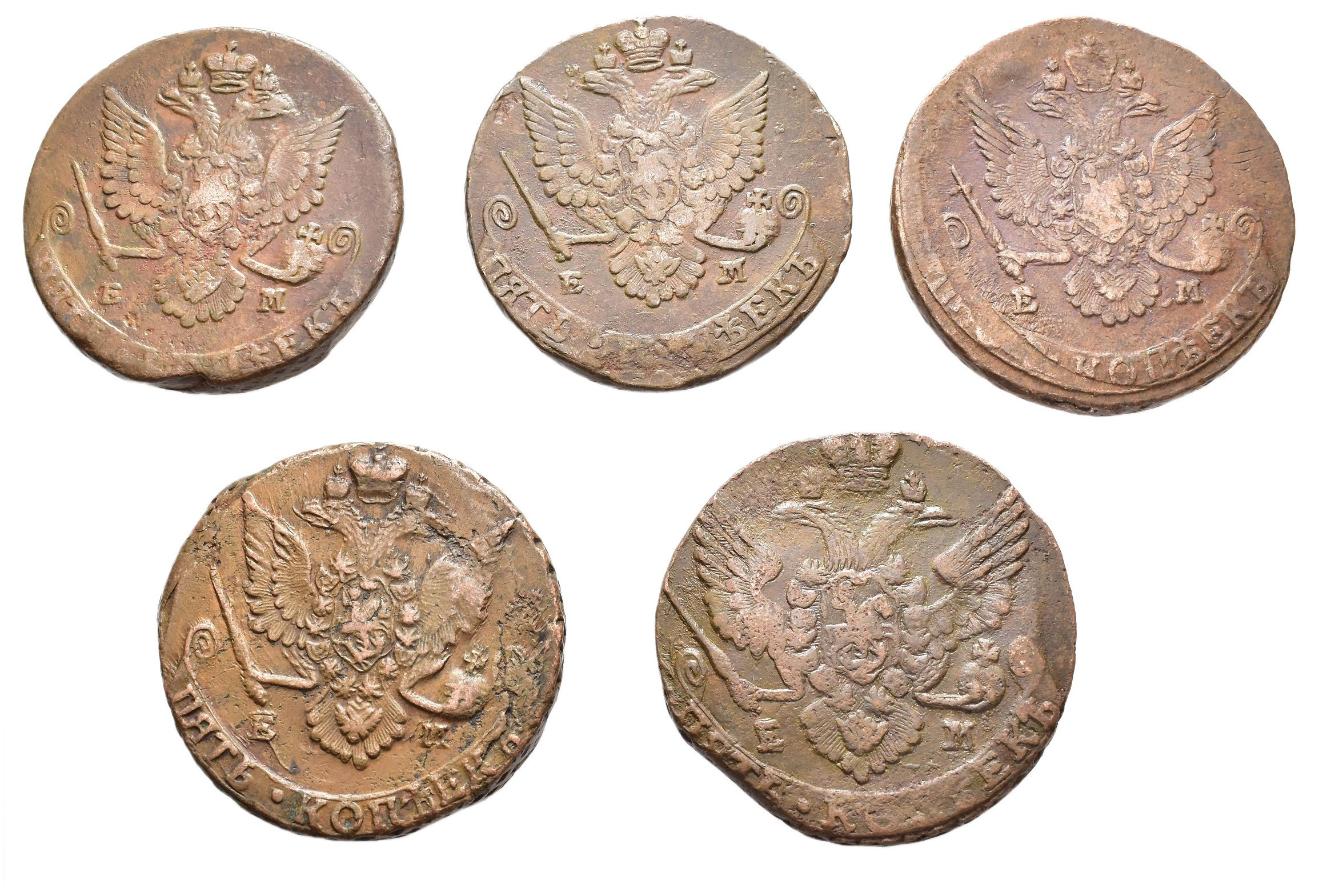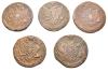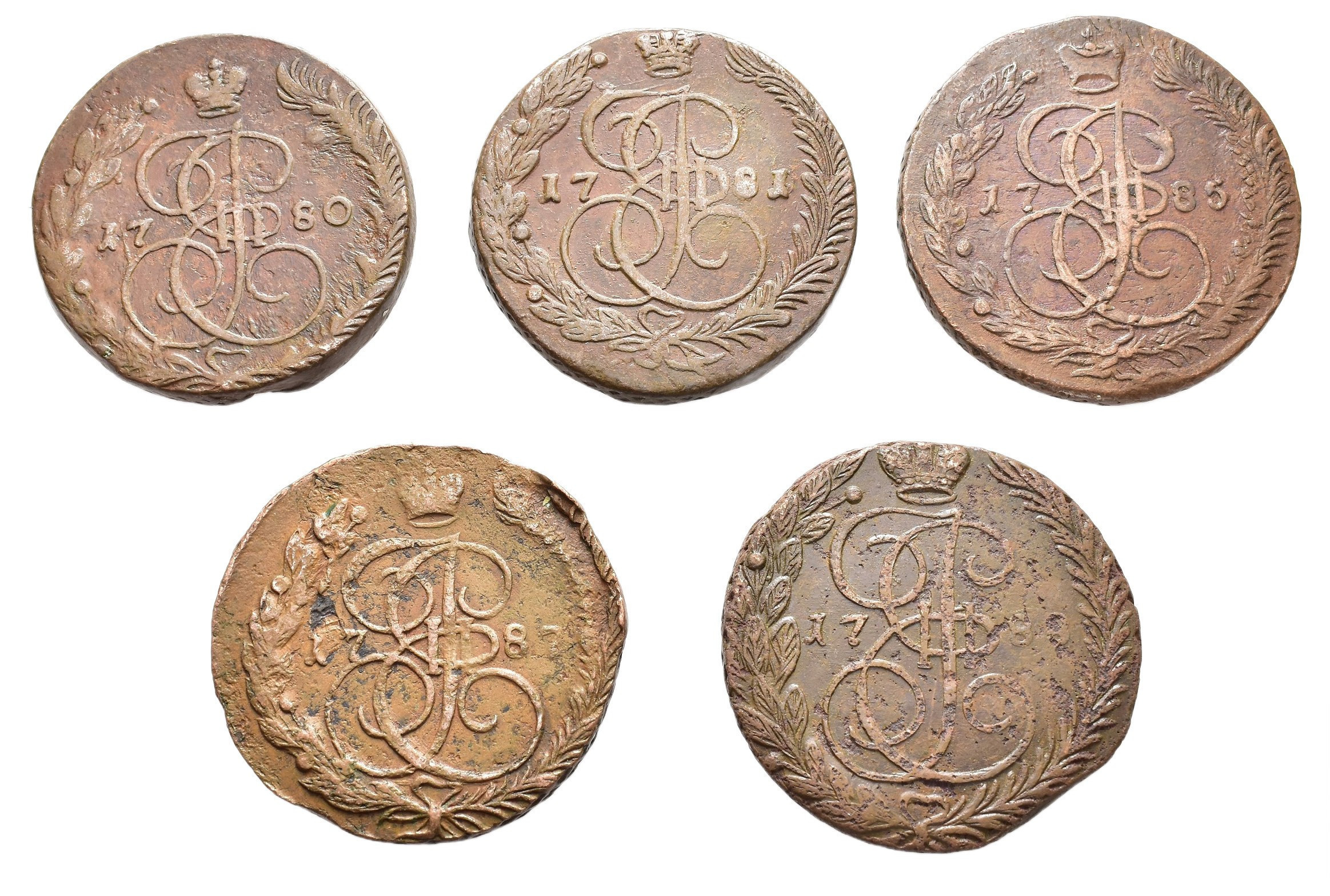 MONEDA EXTRANJERA. RUSIA. Catalina II. Lote de 5 kopeks. Ekaterimburgo. 1780, 1781, 1785, 1787 y 1788. C-59.3. Calidad media MBC-/MBC.