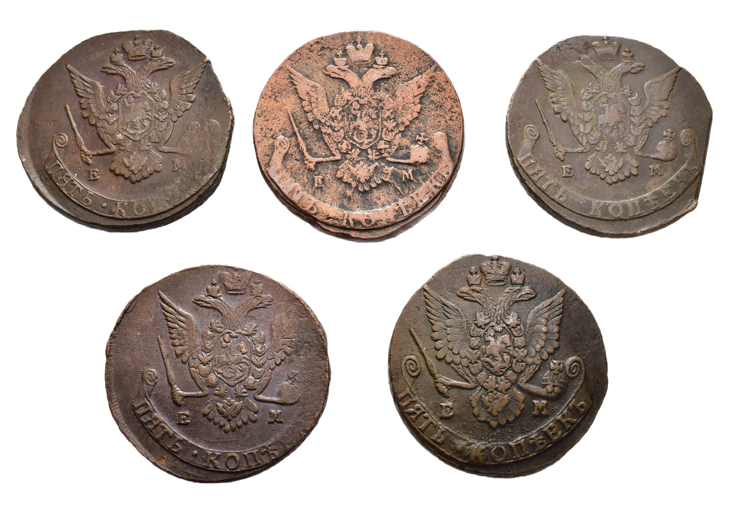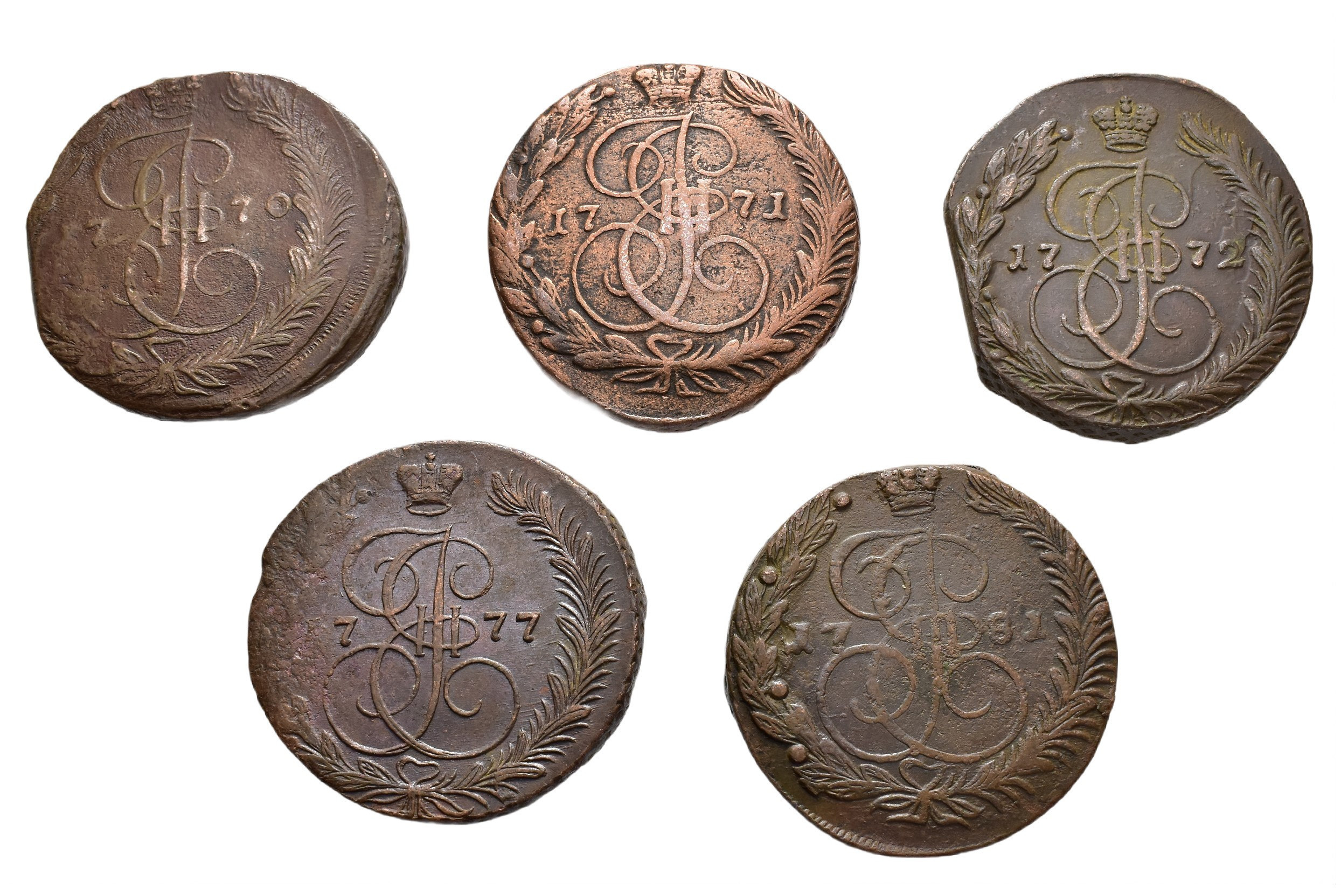 MONEDA EXTRANJERA. RUSIA. Catalina II. Lote de 5 kopeks. Ekaterimburgo. 1770, 1771, 1772, 1777 y 1781. C-59.3. Calidad media MBC-/MBC.