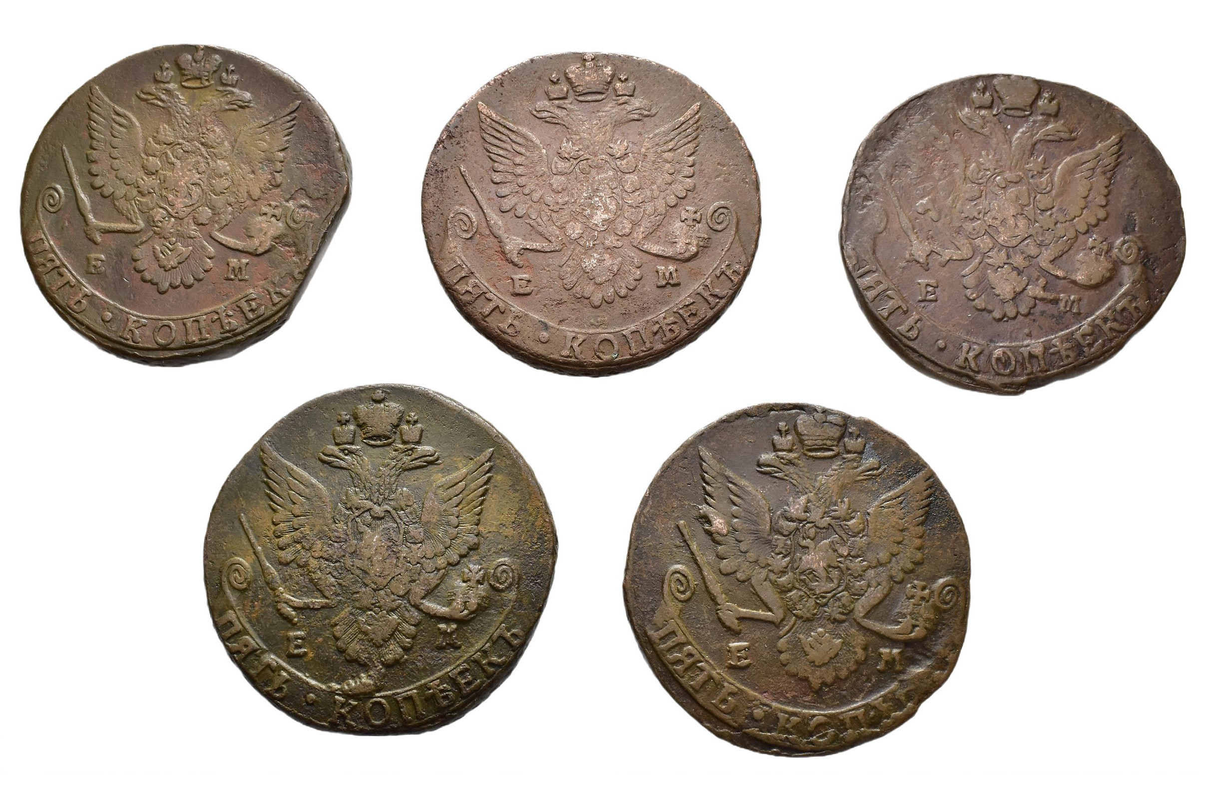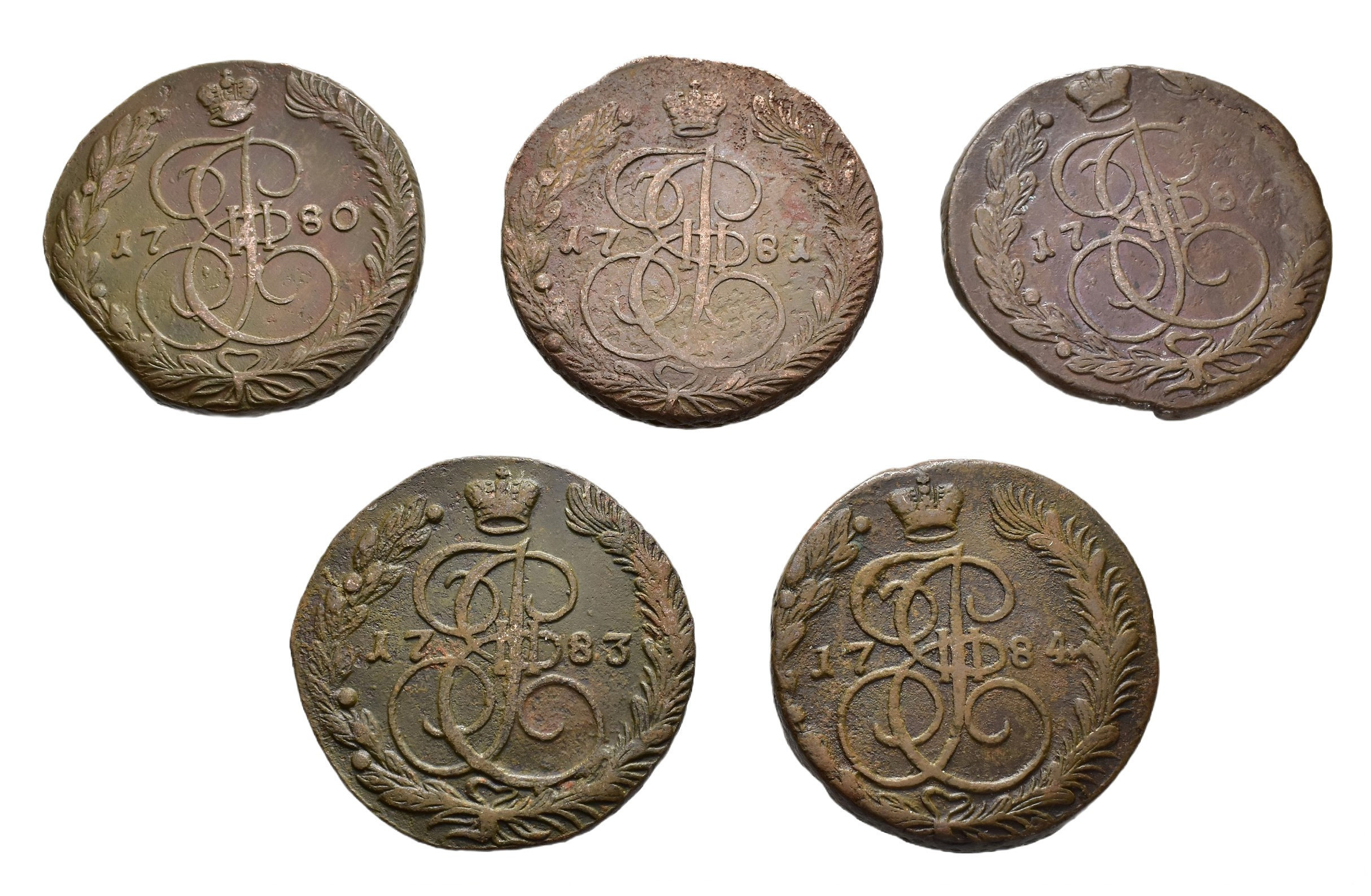 MONEDA EXTRANJERA. RUSIA. Catalina II. Lote de 5 kopeks. Ekaterimburgo. 1780-1784. C-59.3. Calidad media MBC-/MBC.