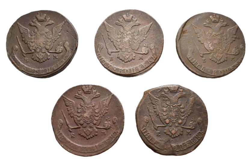 MONEDA EXTRANJERA. RUSIA. Catalina II. Lote de 5 kopeks. Ekaterimburgo. 1771-1774. C-59.3. Calidad media MBC-/MBC.