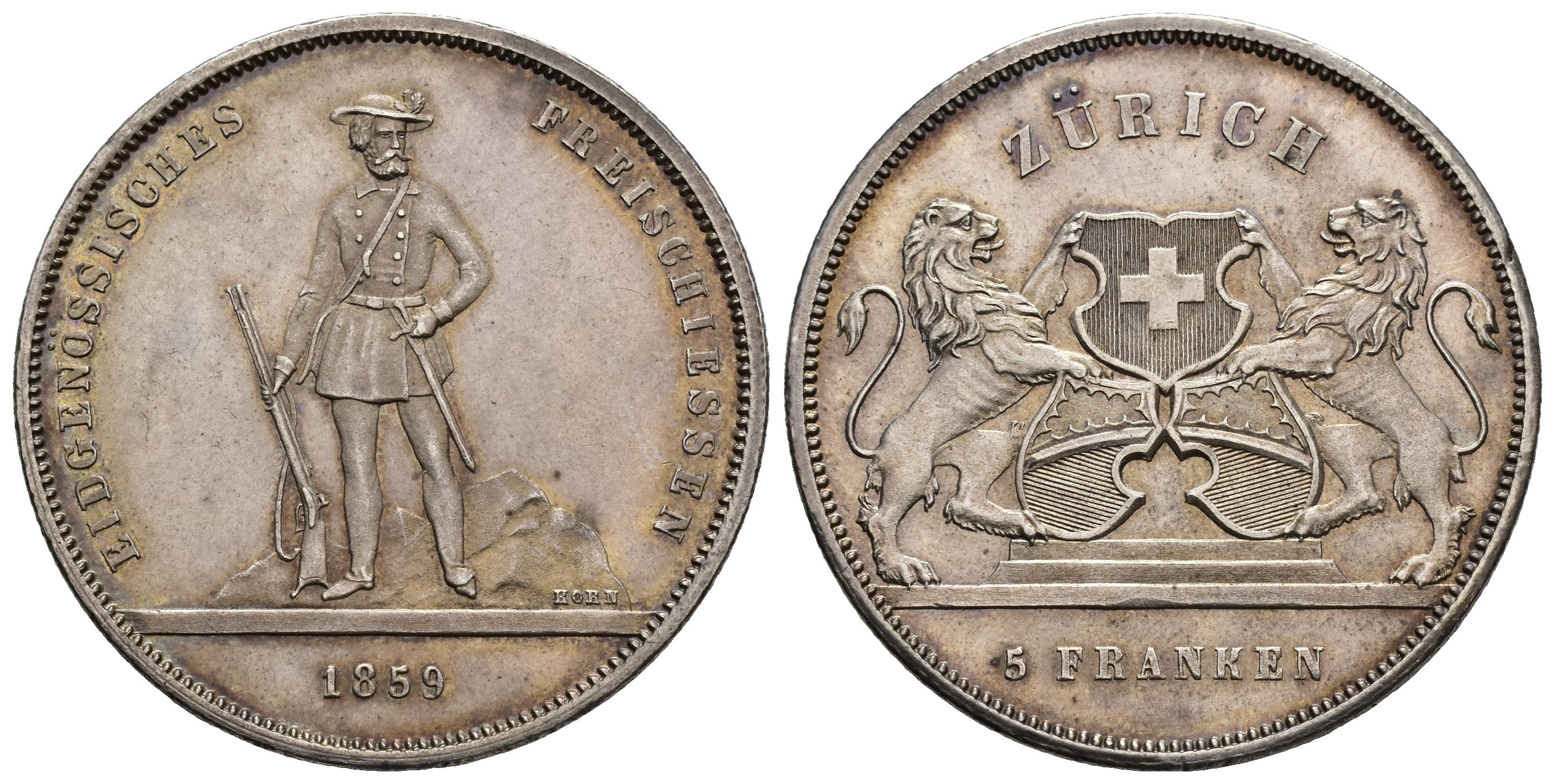 MONEDA EXTRANJERA. SUIZA. Zúrich. 5 francos. 1859. Festival de Tiro. AR 25,02 g. 37,2 mm. KM-X55. Pequeño defecto en gráfila. R.B.O. EBC+/EBC. Rara.