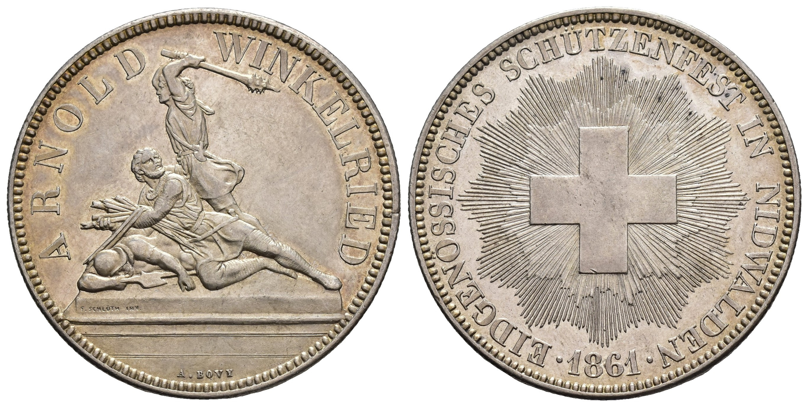 MONEDA EXTRANJERA. SUIZA. Nidwalde. 5 francos. 1861. AR 24,92 g. 37,1 mm. KM-X56. Pequeñas marcas. B.O. EBC. Rara.