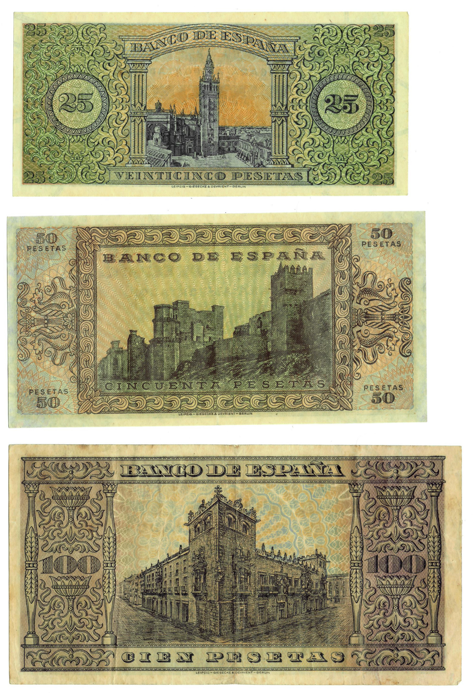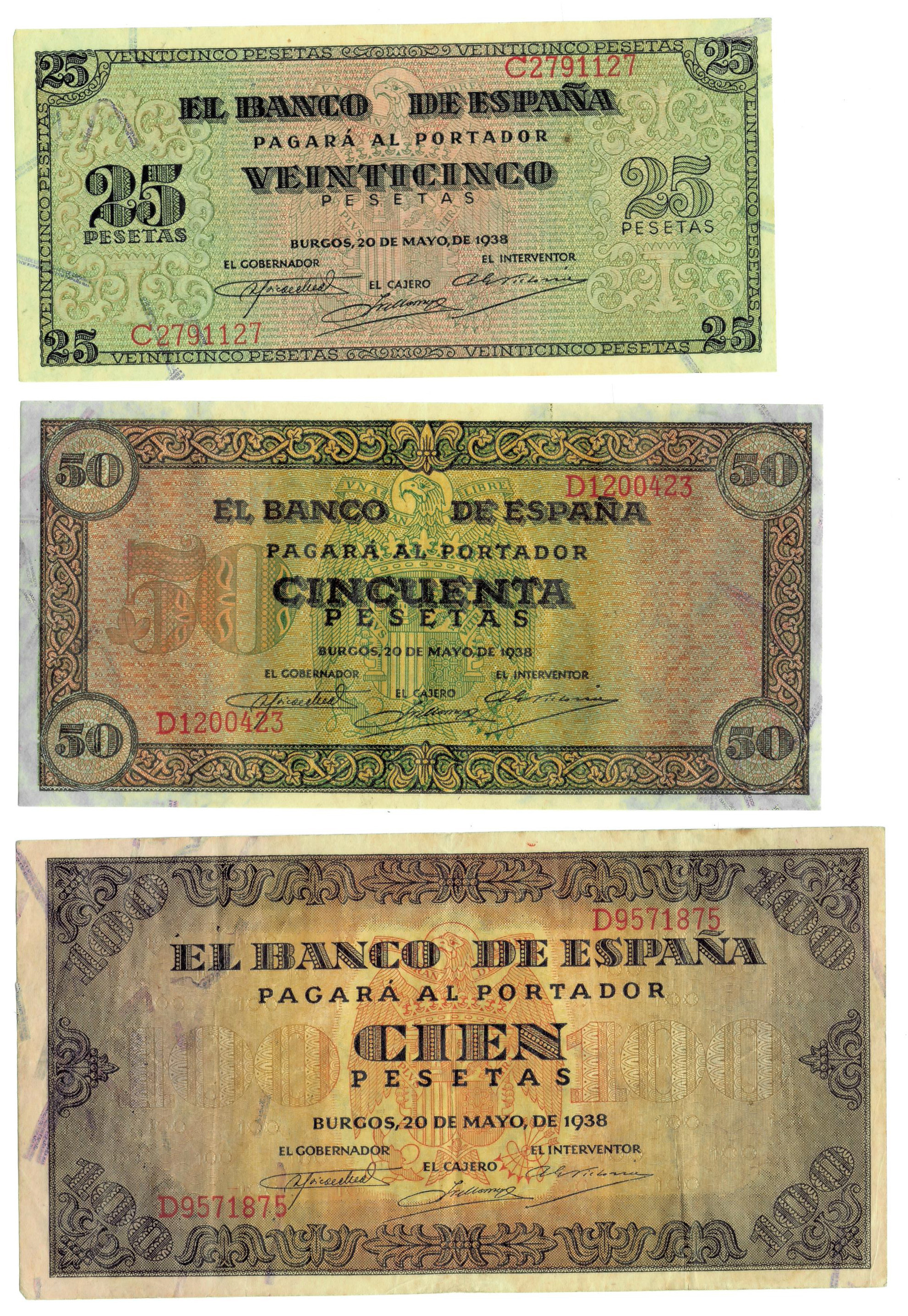 BILLETES ESPAÑOLES. BANCO DE ESPAÑA. Burgos. Lote de 3 billetes. 25, 50 y 100 pesetas, 20 de mayo de 1938, Serie C, D y D respectivamente, ED-430A/ 431A/ 432a. MBC a EBC
