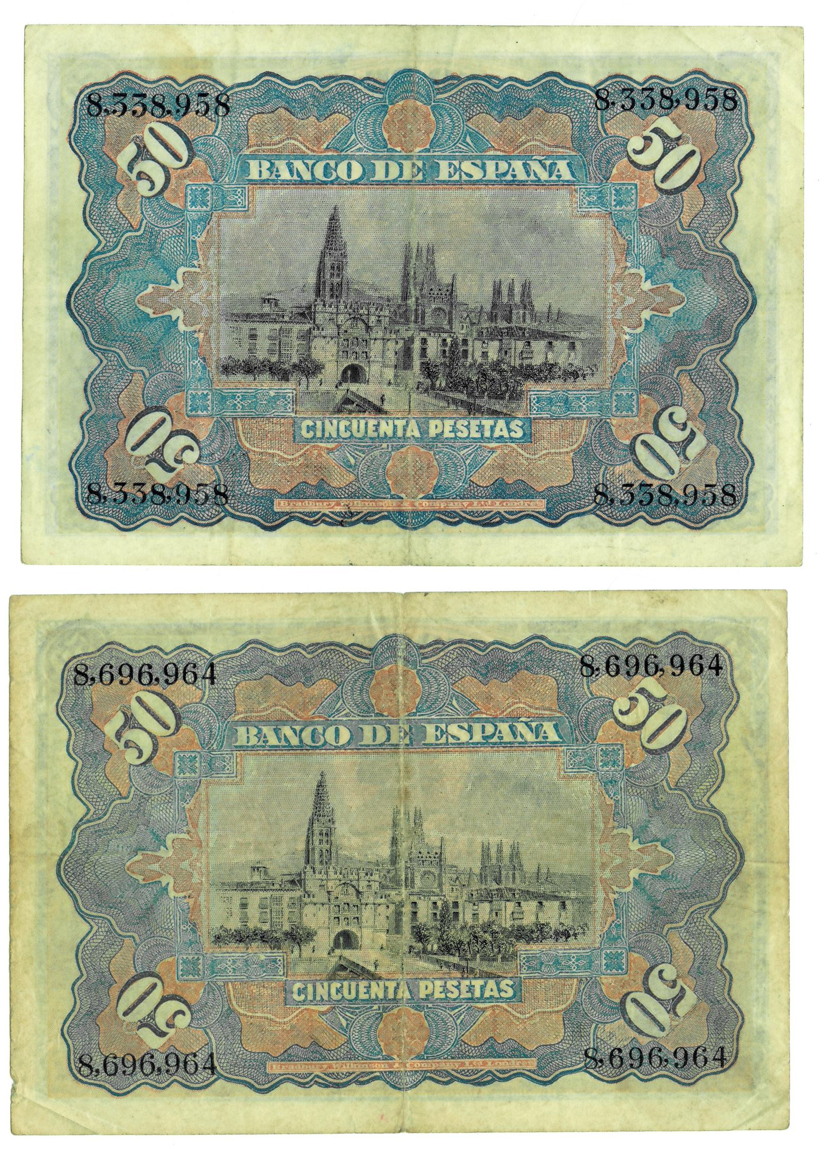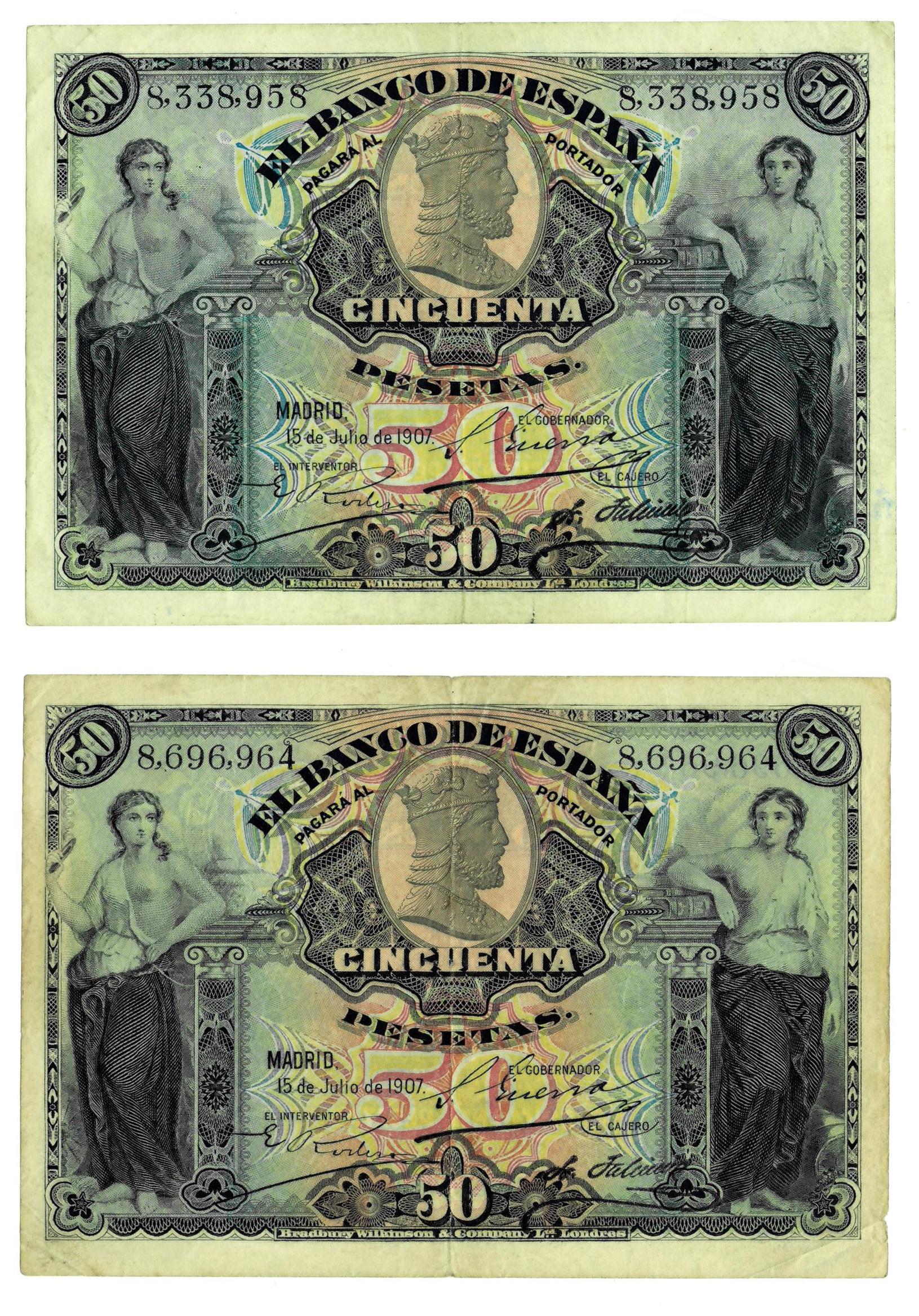 BILLETES ESPAÑOLES. BANCO DE ESPAÑA. Lote de 2 billetes. 50 pesetas, 15 de julio de 1907, Sin serie, uno de ellos con sello seco de la República, ED-319/338. BC+/MBC-. Sin roturas, pero bastante maltrato.