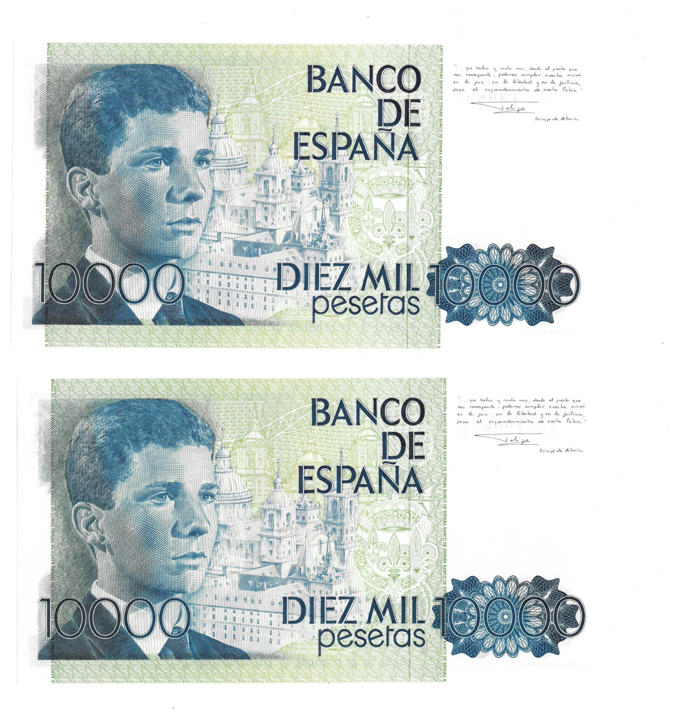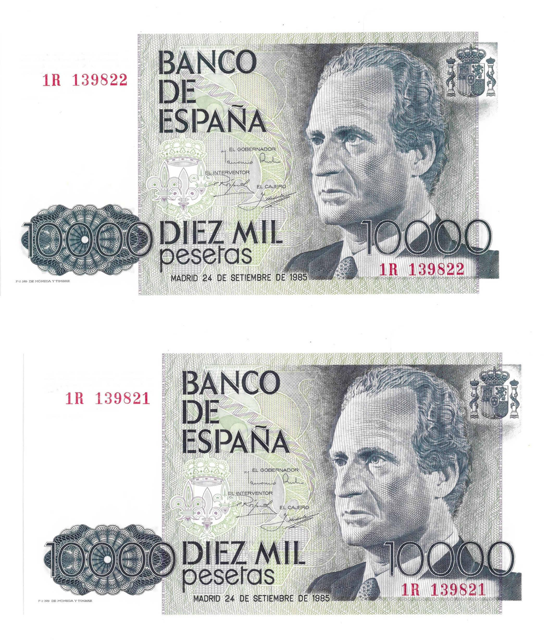 BILLETES ESPAÑOLES. BANCO DE ESPAÑA. 10000 pesetas, 24 de septiembre de 1985, Serie 1R, ED-481a. SC-. Pareja correlativa
