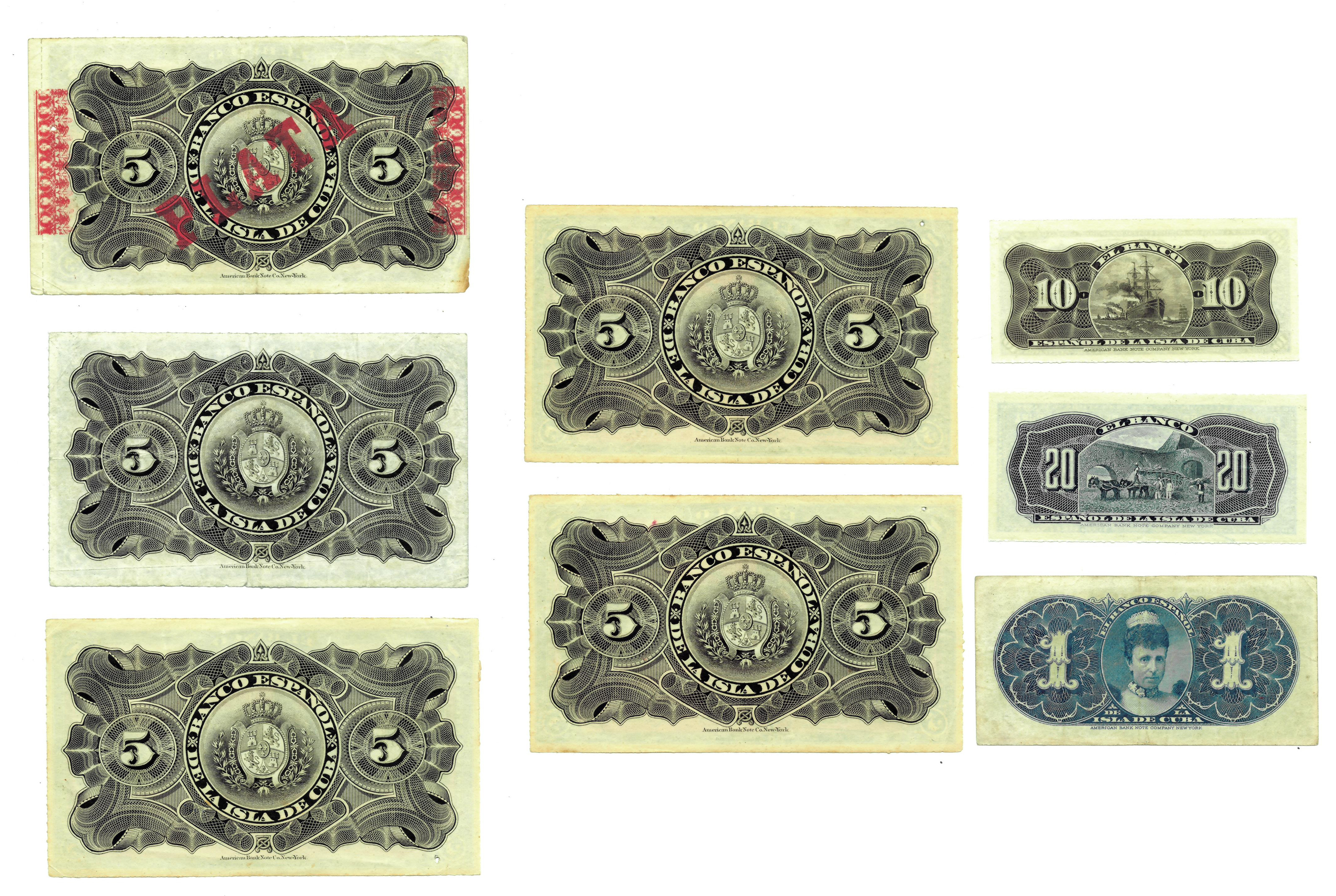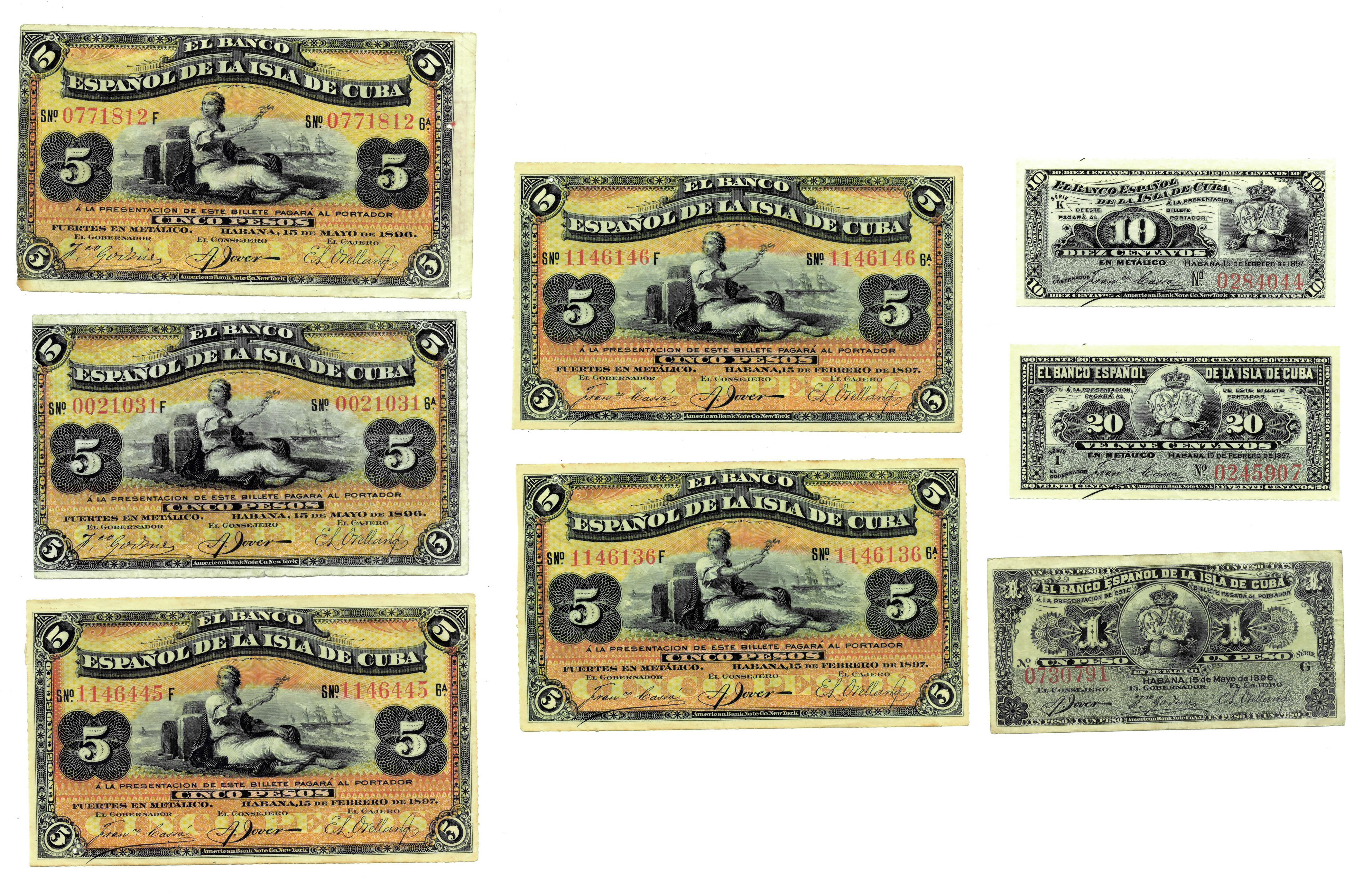 BILLETES DE ULTRAMAR. CUBA. BANCO ESPAÑOL DE LA ISLA DE CUBA. Lote de 8 billetes. 1 peso (1) y 5 pesos (2), 15 de mayo de 1896; 10 centavos (1), 20 centavos (1) y 5 pesos (3), 15 de febrero de 1897, ED-80/81/84/85/86. MBC a SC. A EXAMINAR