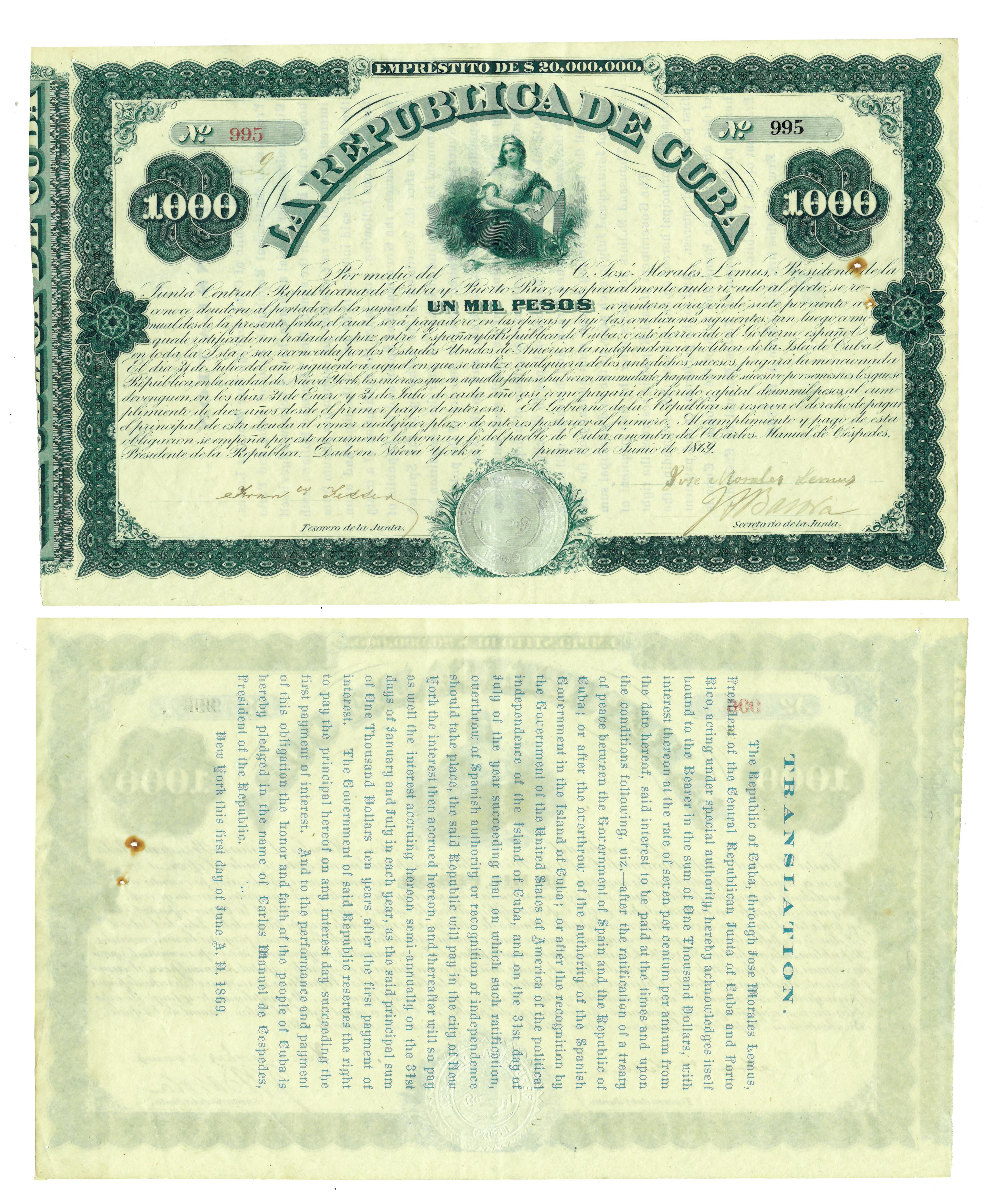 BILLETES DE ULTRAMAR. CUBA. LA REPÚBLICA DE CUBA. 1000 pesos, 1 de junio de 1869. Empréstito de 20 millones de pesos de la Junta Central de la Repúblicana de Cuba y Puerto Rico. Firmado por José Morales Lemus y Francisco Fesser. MBC. Varios puntos de grapa, uno oxidado