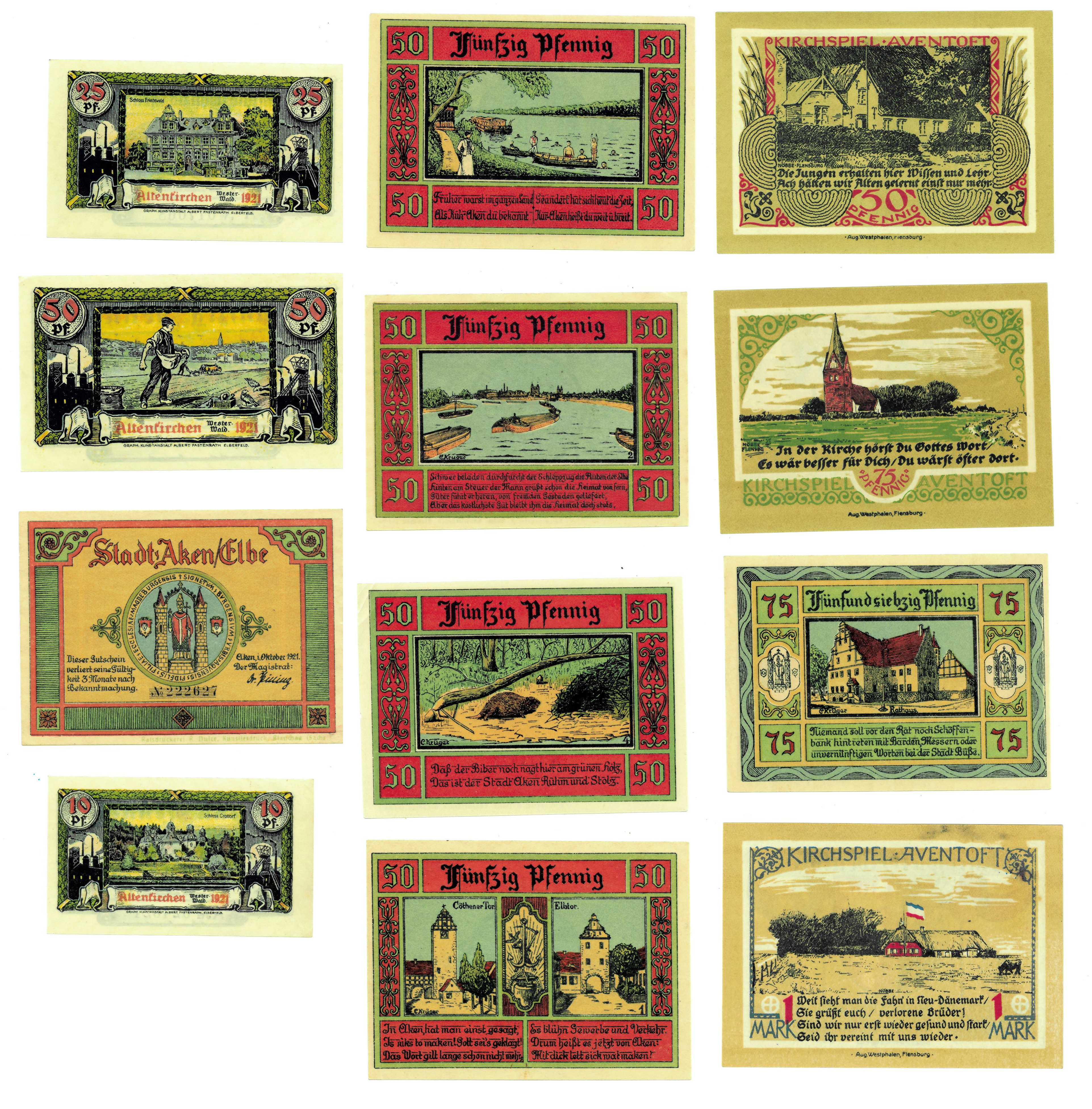 BILLETES EXTRANJEROS. ALEMANIA. Lote de 12 billetes: Aventoft 1921 (50 y 75 Pf. Y 1 marco); Altenkirchen 1921 (10, 25 y 50 Pf.) y Aken 1921 -25, 50 (4) y 75 Pf.-.SC.
