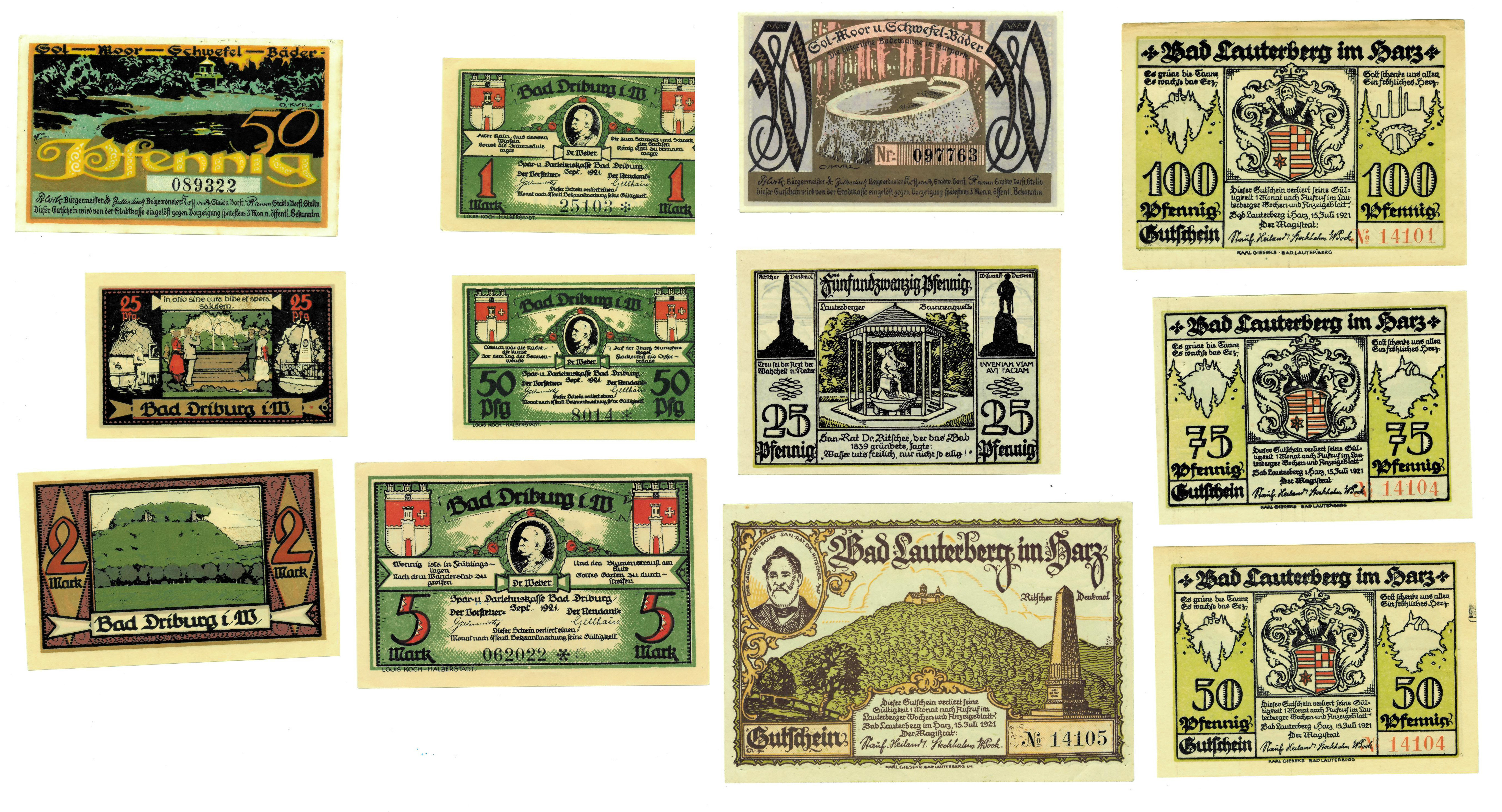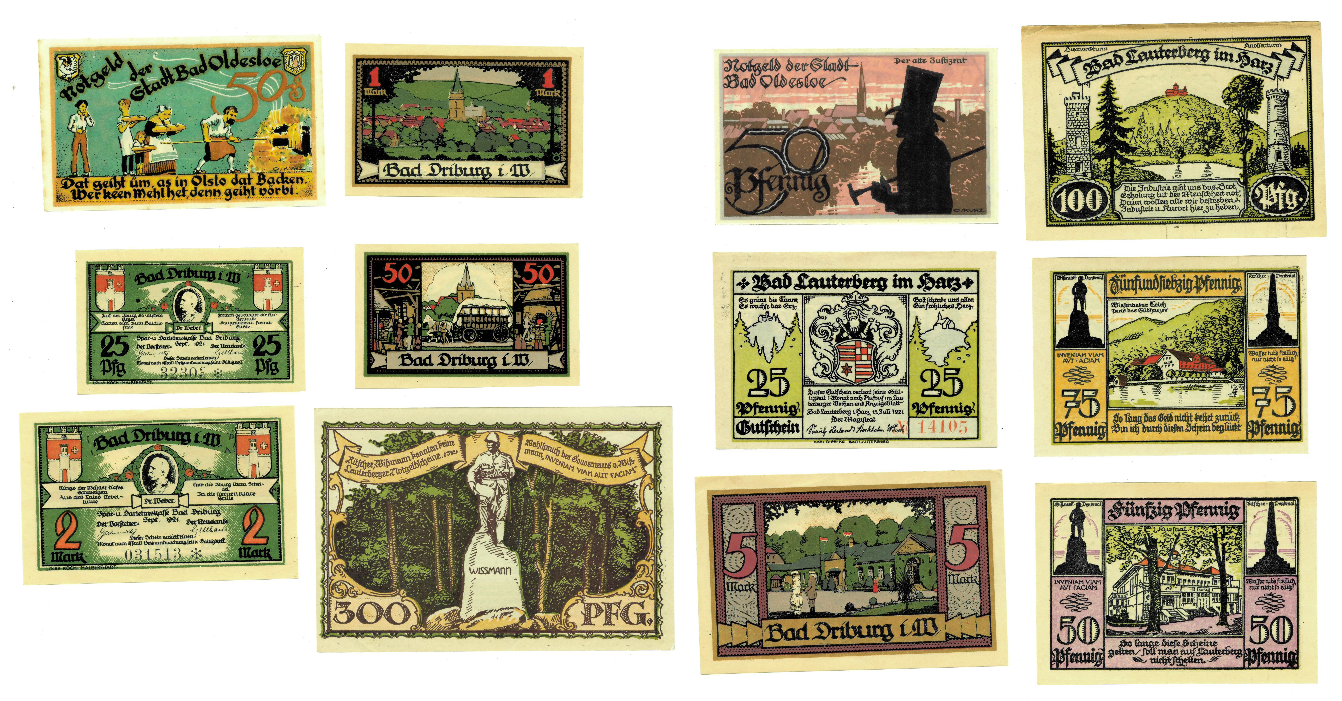 BILLETES EXTRANJEROS. ALEMANIA. Lote de 12 billetes: Bad Dribug 1921 (25 y 50 Pf. Y 1, 2 y 5 marcos); Bad Lauterberg 1925 (25, 50, 75, 100 y 300 Pf.) y Bad Oldesloe, 50 Pf. (2). SC.