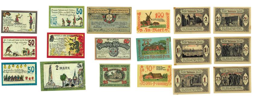 BILLETES EXTRANJEROS. ALEMANIA. Lote de 18 billetes: Bordelum 1922 -50 y 75 Pf. Y 1 marco-; Eutin 1920 -25, 50 y 100 Pf. Y 2 marcos; Dulmen 1921 -50y 75 Pf. Y 1, 1,5 y 2,5 marcos. SC-/SC.