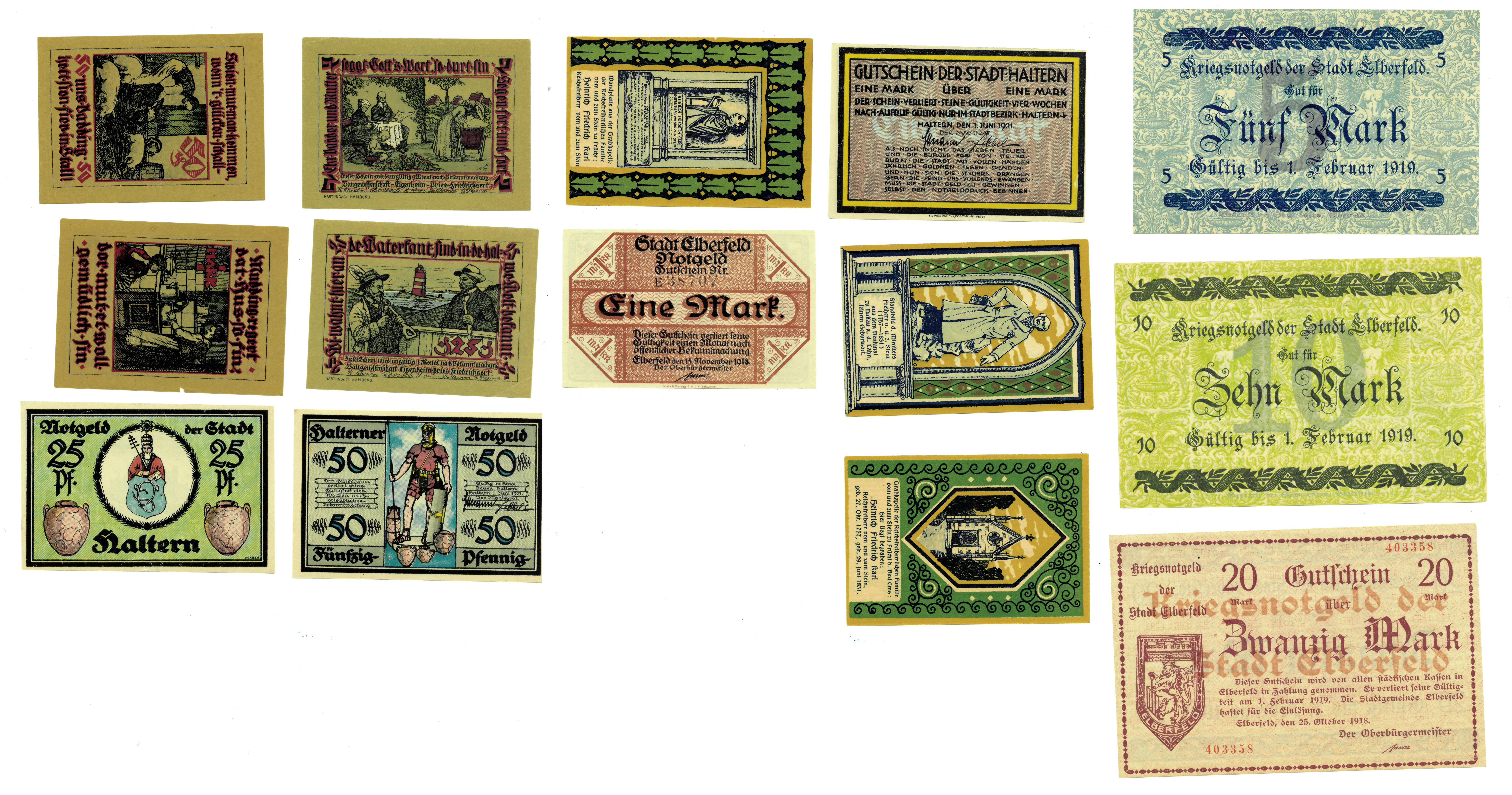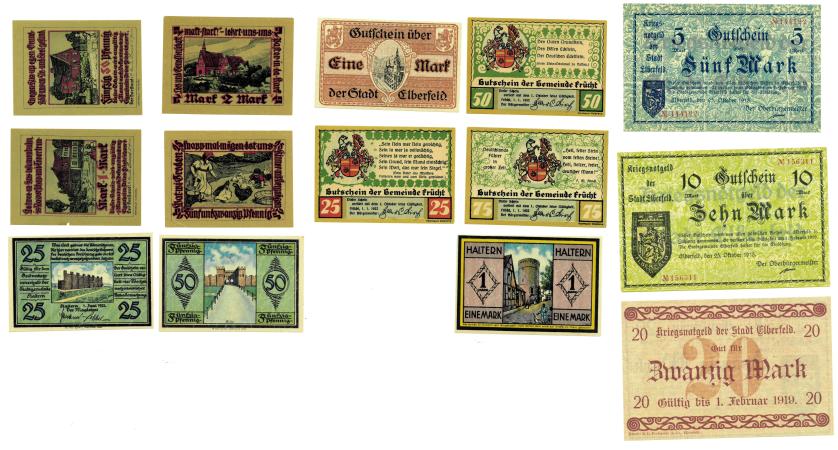 BILLETES EXTRANJEROS. ALEMANIA. Lote de 14 billetes: Fruscht (3), Elberfeld (4), Haltern (3) y Friedridjsort (4). SC.