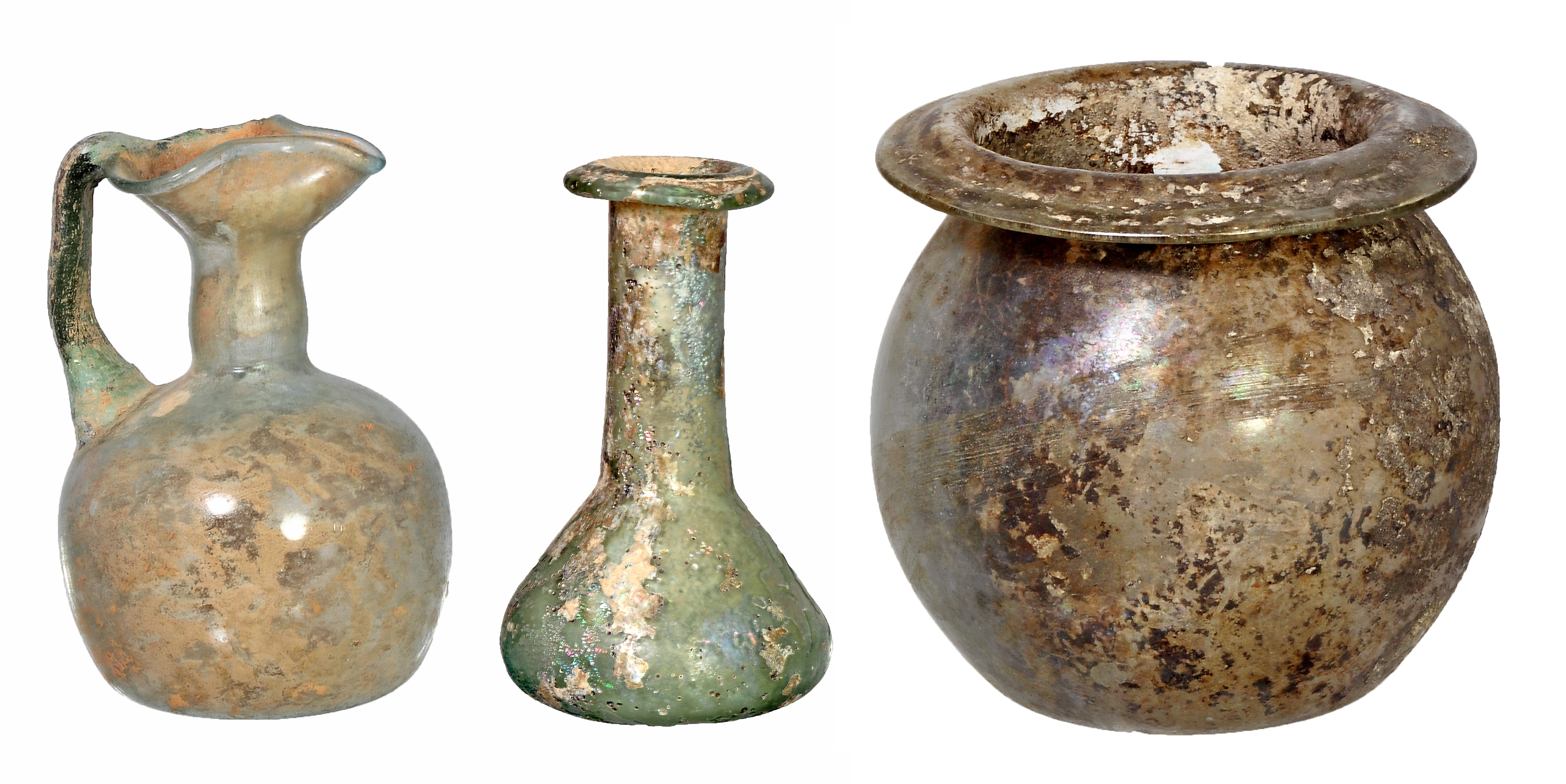 ROMA. Imperio Romano. Vidrio. Lote de tres vidrios: Ungüentario con depósito troncocónico, Jarrita / oinochoe y pequeña urna. Presenta irisaciones. Diámetro: 6 cm. Altura: 4,6-11,5 cm. Procedente de colección privada española años 1970-80.