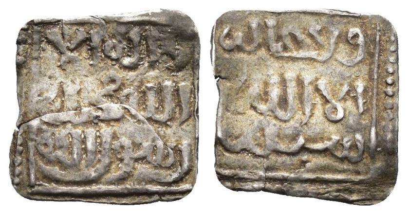 794   -  TAIFAS ALMOHADES. ANÓNIMAS. Dírham. Sin ceca. Sin fecha. AR 1,36 g. 11x11 mm. Inédito. MBC. Muy rara.