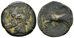 2058   -  COLECCIÓN CORES. REYES NÚMIDAS Y MAURETANOS. MASINISSA O MICIPSA. Unidad. Cirta (238-148 o 148-118 a.C.). A/ Cabeza del rey laureada a izq. R/ Caballo galopando a izq., debajo letras púnicas mn. AE 9,83 g. 26 mm. COP-510; MAA-12; CC-5679, mismo ejemplar. Vanos. BC+. Muy escasa.