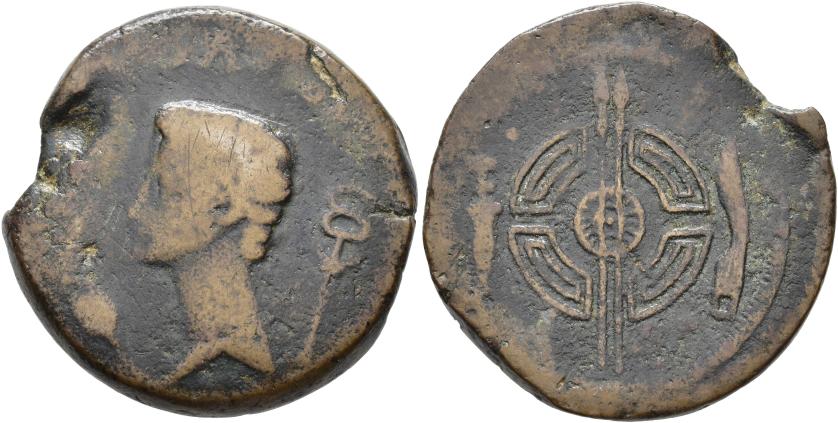 HISPANIA ANTIGUA. EMISIONES DEL NOROESTE. AUGUSTO. Dupondio. A/ Cabeza a izq., delante palma , detrás caduceo; IMP AVG (DIVI F). R/ Rodela con dos lanzas entre cuchillo y falcata hacia arriba. AE 18,49 g. 30,4 mm. I-1702; APRH-2; ACIP-3300; Orol-AN.3, mismo ejemplar. Defectos de cospel. BC-/BC+.
