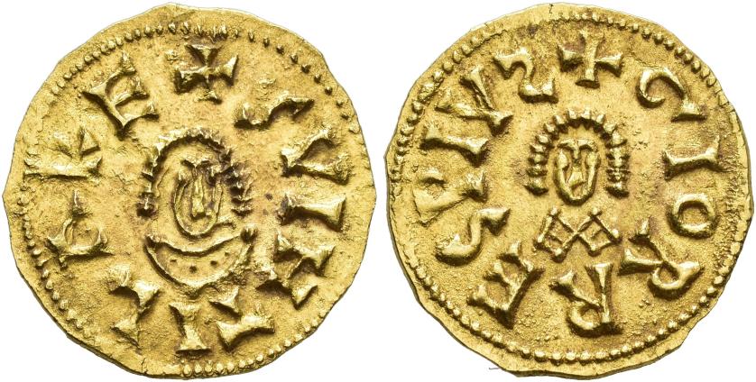 REINO SUEVO. Tremissis. Marcas estrella y R invertida. AU 1,25 g. 15,2 mm. C&M-lám.13.3, mismo ejemplar; Orol-SU.4, mismo ejemplar. EBC-. Muy rara.