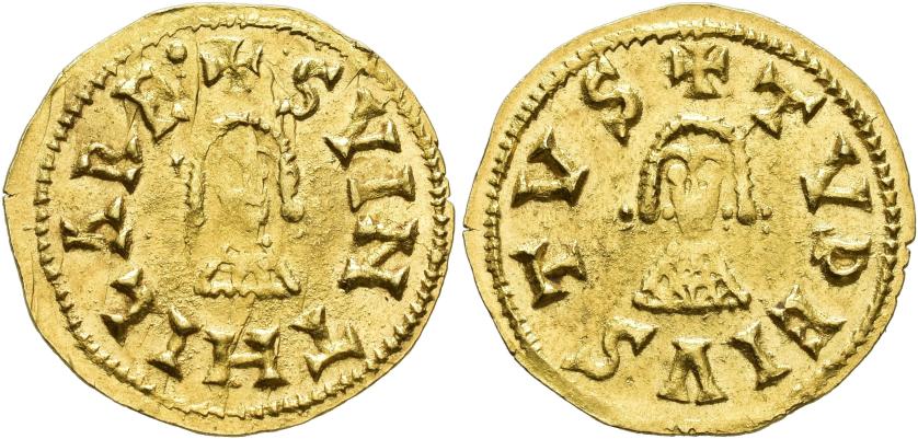 REINO SUEVO. Tremissis. A nombre de Valentiniano. AU 1,45 g. 15,1 mm. C&M-lám. 6.6, mismo ejemplar; Orol-SU.6, mismo ejemplar. Raya en rev., marcas y golpecitos. MBC. Rara.
