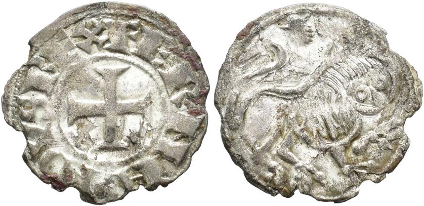 REINOS DE CASTILLA Y LEÓN. ALFONSO VII. Dinero. ¿Lugo? A/ +: LEONI. R/ + IMPATUR. IN-PE a los lados de la cruz. Pequeña L al final y al principio de la ley. del anv. y rev. VE 0,9 g. 18,7 mm. III-No; BMM-106.1, mismo ejemplar ilutrado; Orol-ME.4, mismo ejemplar. Mínimas roturas al borde que no afectan al diseño. MBC+. Única.