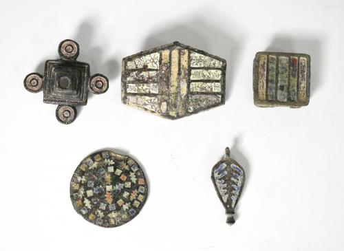 ROMA. Bajo Imperio. Lote de 5 bronces tardorromanos: tres apliques, un colgante y disco circular con decoración de pasta vítrea polícroma (ss. IV-V d.C.). Bronce y esmalte. Altura: 2,3-3,4 cm. Procedente de colección privada española años 1970-80.