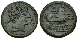 HISPANIA ANTIGUA. IKESANKOM KOMBOUTO. Unidad. A/ Cabeza masculina con collar a der., delante delfín, detrás KoNBoUTo. R/ Jinete lancero a der., debajo sobre línea IKeSANKoM. AE 9,15 g. 25,6 mm. I-1421. ACIP-1599. Pátina verde oscuro. EBC-/MBC+. Muy escasa.