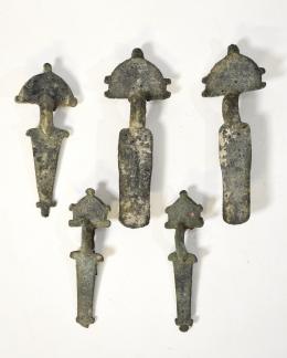 2080   -  PUEBLOS GERMÁNICOS. Período visigodo. Lote de 5 fíbulas con decoración geométrica en forma de pequeños círculos (ss. V-VII d.C.). Pátina verdosa. Bronce. Longitud entre 8,3 y 11,5 cm.