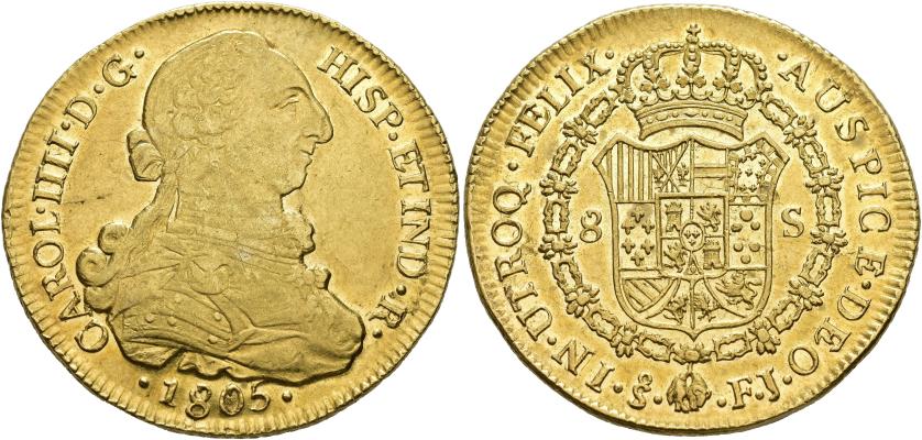 CARLOS IV (1788-1808). 8 escudos. Santiago. 1805. FJ. AU 26,99 g. 37,2 mm. VI-1431; AC-1775. Pequeñas marcas. B.O. EBC-/EBC.