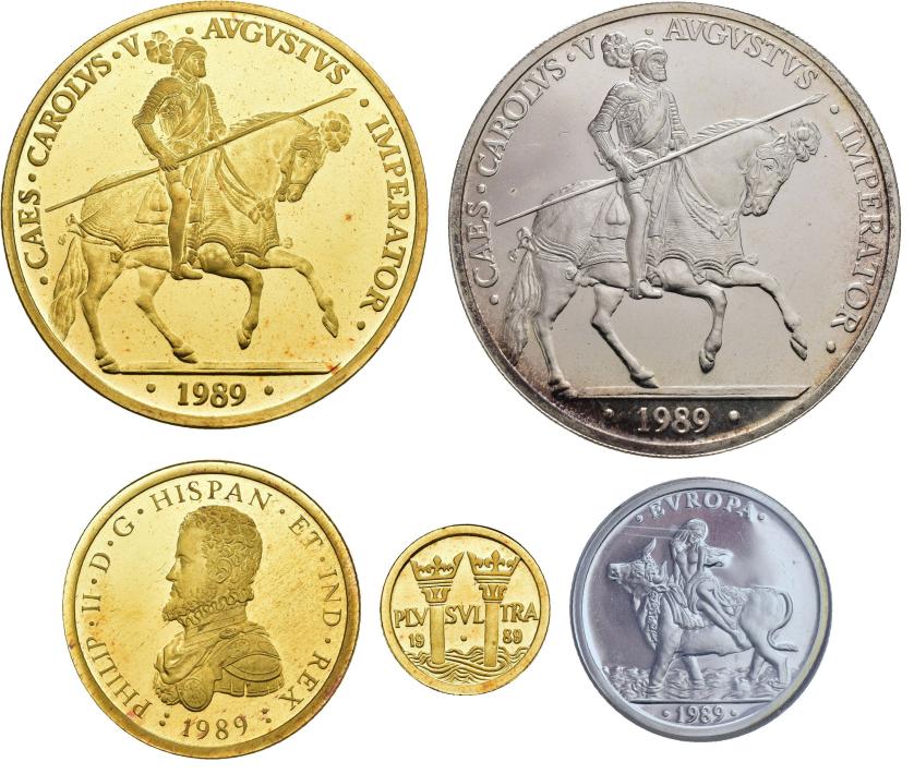 JUAN CARLOS I. Lote de 5 estuches de monedas conmemorativas FNMT, 1989: 1 ecu (AR 6,72 g), 5 ecu (AR 33,62 g), 10 ecu (AU 3,45 g), 50 Ecu (17,27 g) y 100 ecu (AU 34,55 g). En sus estuches y con certificados. FDC.