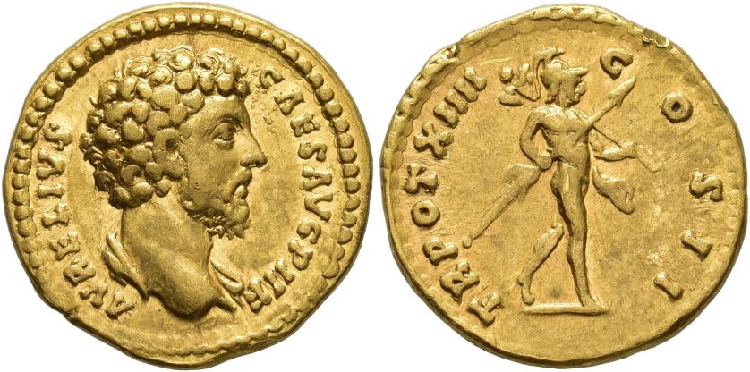 IMPERIO ROMANO. MARCO AURELIO (161-180). Áureo. Roma (159-160). A/ Cabeza drapeada al hombro a der.; AVRELIVS CAES AVG PII F. R/ Marte avanzando a der. con lanza y trofeo; TR POT XIII COS II. AU 7,22 g. 19,7 mm. RIC-481A; CAL-1973. MBC.