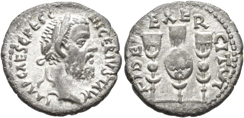 IMPERIO ROMANO. PESCENIO NÍGER (193-194). Denario. Antioquía (193-194). A/ Cabeza laureada a der.; IMP CAES PESC NIGER IVST AVG. R/ Tres estandartes, el central con escudo con inscripción VIC AVG poco visible; FIDEI EXERCITVI. AR 2,7 g. 17,8 mm. RIC-19 var. anv. MBC. Rara.
