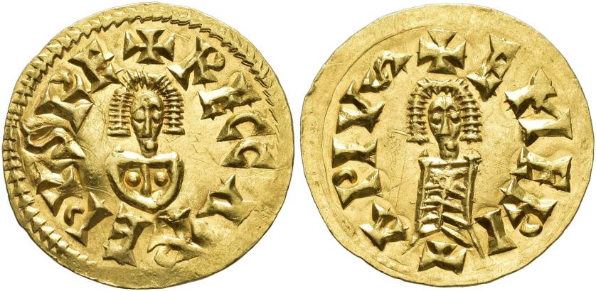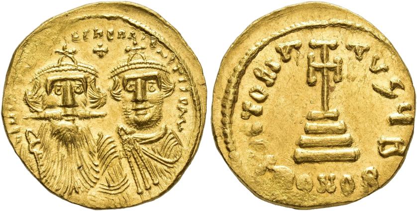 IMPERIO BIZANTINO. HERACLIO Y HERACLIO CONSTANTINO (610-641). Sólido. Constantinopolis (610-641). A/ Bustos frontales con corona y clámide, en medio cruz. R/ Cruz potenzada sobre gradas, oficina B. AU 4,42 g. 20,4 mm. SBB-749. Vanos. B.O. EBC.