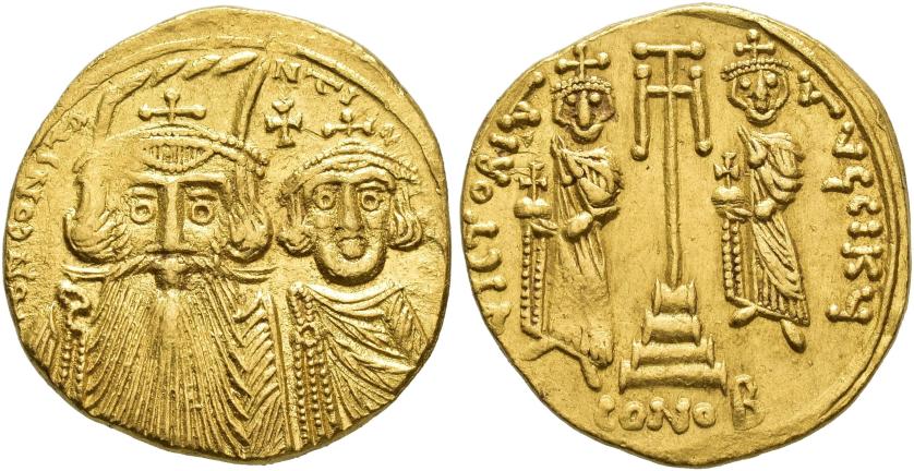 IMPERIO BIZANTINO. CONSTANTE II (641-668). Sólido. Siracusa (641-663). A/ Bustos frontales de Constante II y Constantino IV, en medio cruz. R/ Cruz potenzada sobre gradas flanqueada por Heraclio y Tiberio; ley. terminada en AVG CIKU. AU 4,34 g. 19,3 mm. SBB-1085. EBC-.