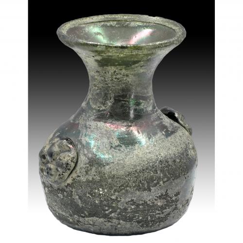 2729   -  ÁRABE-BIZANTINO. Botella con falsas asas circulares (IV-VI d.C.). Vidrio verde. Presenta irisaciones y numerosas burbujas. Altura 9,1 cm.