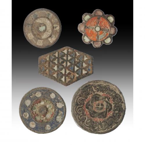ROMA Y ÉPOCA MEDIEVAL. Lote de cinco objetos (IV-V d.C. y XIII-XIV d.C.). Bronce. Tres apliques, un disco circular decorado con pasta vítrea y un pasarriendas esmaltado decorado con rstrella de David enlazada. Medidas 2,0-3,1 cm.