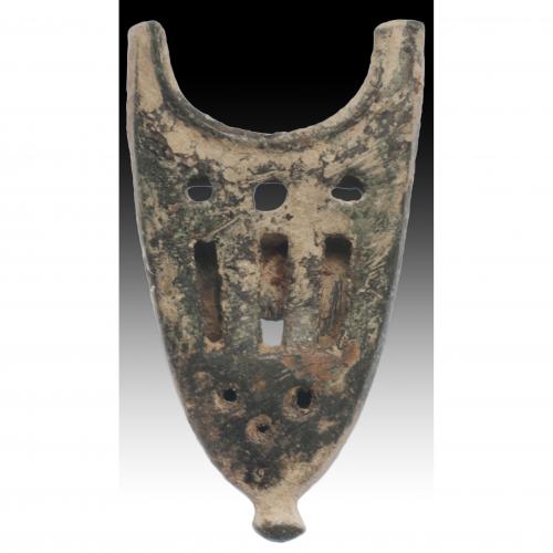ROMA. Imperio Romano. Placa triangular (I-IV d.C.). Plomo. Con representación de cabeza de frente con arandela. Altura 7,2 cm.
