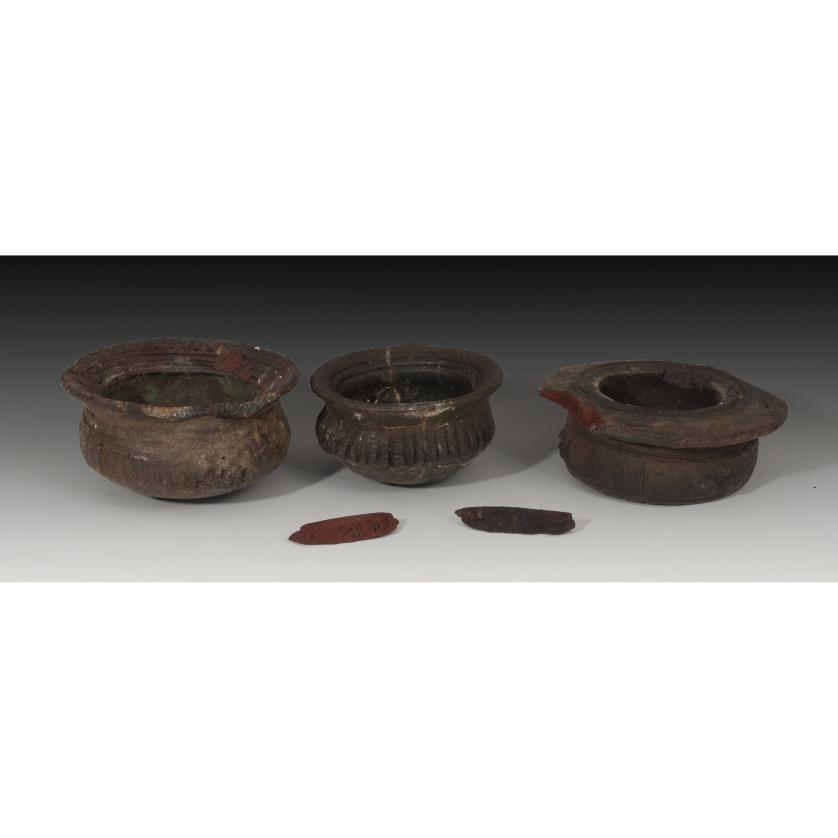 2743   -  PREHISPÁNICO. Período Formativo Temprano-Medio. Lote de tres recipientes cerámicos de diversas épocas y culturas. Altura 4,3-6,4. Diámetro 10,2-12,5. Labio fragmentado.