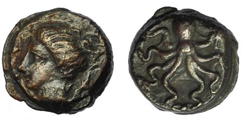 GRECIA ANTIGUA. SICILIA. Siracusa. Tetras (425-410 a.C.). A/ Cabeza de Aretusa a izq., detrás delfín. R/ Pulpo. AE 13 mm. 3,17 g. 13,3 mm. COP-677 vte. SBG-no. MBC.