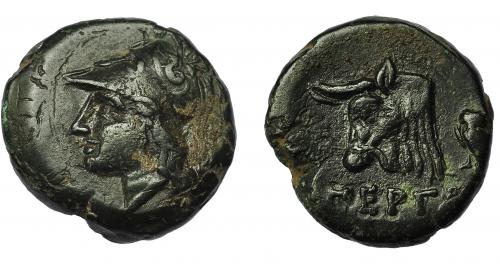GRECIA ANTIGUA. MISIA. Pérgamo. AE (310-282 a.C.). A/ Cabeza de Atenea a izq. R/ Cabeza de toro a izq., detrás lechuza. AE 4,7 g. 16,8 mm. COP-333. Concreciones. Pátina verde oscuro. MBC.
