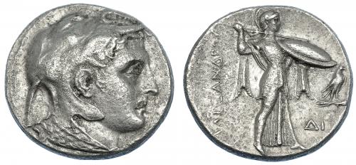 GRECIA ANTIGUA. EGIPTO. REINO PTOLEMAICO. Ptolomeo I (a nombre de Alejandro). Tetradracma. A/ Cabeza de Alejandro con piel de elefante. R/ Atenea avanzando a der. con lanza y escudo; delante delta I y águila sobre haz de rayos, detrás ley. griega ALEXANDROY. AR 16,3 g. 27,3 mm. COP-no. SBG-7747 vte. Oxidaciones limpiadas. MBC-/MBC.
