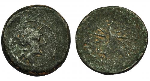 2098   -  HISPANIA ANTIGUA. VALENTIA. Cuadrante. A/ Cabeza de Roma a der., detrás 3 glóbulos. R/ Cornucopia sobre haz de rayos. AE 3,9 g. 19,2 mm. I-2515. ACIP-2056. Pátina verde. BC-. Rara.