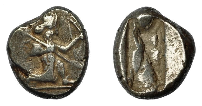 2125   -  GRECIA ANTIGUA. PERSIA. Reyes Aqueménidas. Siclo (Darío I-Jerjes II, 485-420 a.C.). A/ Rey arrodillado a der. con arco y lanza. R/ Punzón incuso. AR 5,6 g. 15,1 mm. COP-280. SBG-4678. BC+.