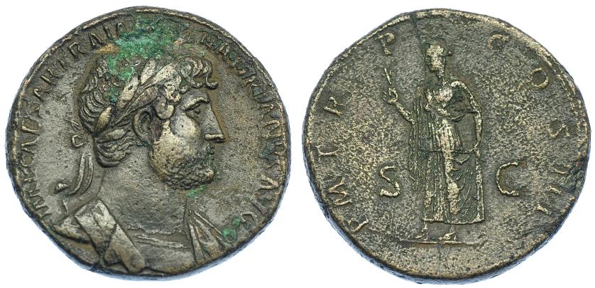 2245   -  IMPERIO ROMANO. ADRIANO. Sestercio. Roma (121-122). A/ Busto laureado y con coraza a der.; IMP CAESAR TRAIAN HADRIANVS AVG. R/ Virtus a izq. Con lanza, parazonium y pisando casco; VIRT-AVG/ S C; P M TR P COS III. AE 28,41 g. 32,7 mm. RIC-652. MBC/MBC-.