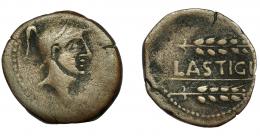 118   -  HISPANIA ANTIGUA. LASTIGI. Semis. A/ Cabeza con casco a der. R/ Dos espigas a der., en medio LASTIGI sobre línea. AE 7,56 g. 27,2 mm. I-1674. ACIP-2372. BC+/MBC-. Rara.