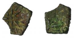 HISPANIA ANTIGUA. GADIR. Octavo de calco. A/ Cabeza frontal de Melkart con leonté. R/ Dos atunes a izq., en medio aleph. AE 0,92 g. 9,9 mm. I-1334. ACIP-661. BC-/BC+. Rara.