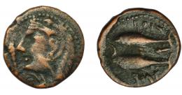 HISPANIA ANTIGUA. GADIR. Mitad. A/ Cabeza de Melkart a izq. R/ Dos atunes a der., en medio letra fenicia ¿peh? tumbada. AE 4,80 g. 18,8 mm. I-1317 vte. ACIP-642. MBC-/BC+. Muy rara.