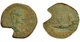 HISPANIA ANTIGUA. ILERCAVONIA-DERTOSA. As. Tiberio. A/ Cabeza laureada a der. R/ Nave, debajo DERT M H I ILERCAVONI. Contramarca palma. AE 5,94 g. 23,7 mm. RPC-207. APRH-207. I-1493. ACIP-3179. Cospel irregular. Pátina verde. BC-/BC+.