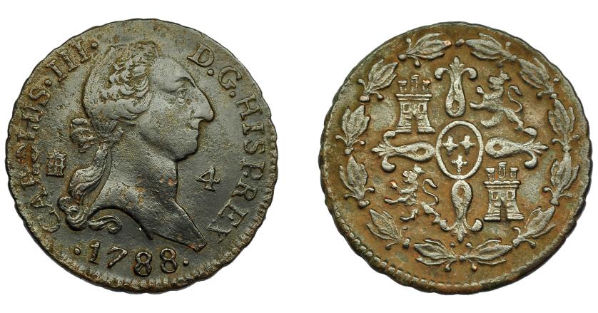 CARLOS III. 4 maravedís. 1788. Segovia. VI-55. Erosiones. MBC-/MBC.