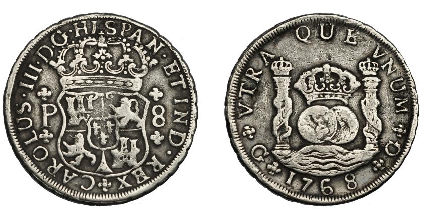 CARLOS III. 8 reales. 1768. Guatemala. P. VI-853. Agujero tapado. Pequeñas marcas. MBC-.