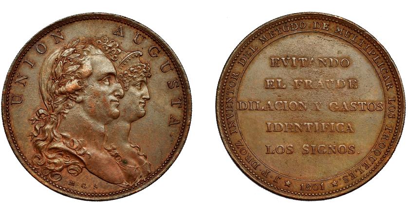 CARLOS IV. Medalla. 1801. Invento de DROZ. Firma M.G.S. Sepúlveda. Canto estriado. AE 30,5 mm. MPN-305 vte. EBC-.