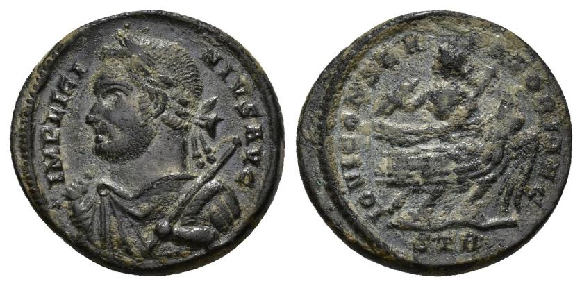 IMPERIO ROMANO. LICINIO. Follis. Treveris (318-319). A/ Busto a izq. laureado, con cetro y haz de rayos; IMP LICINIVS AVG. R/ Júpiter con haz de rayos y cetro, sentado en águila a der.; IOVI CONSERVATORI AVG. -/-//STA . . AE 2,68 g. 16,9 mm. RIC-210. Pátina verde oscuro. MBC+/MBC-. Muy rara.